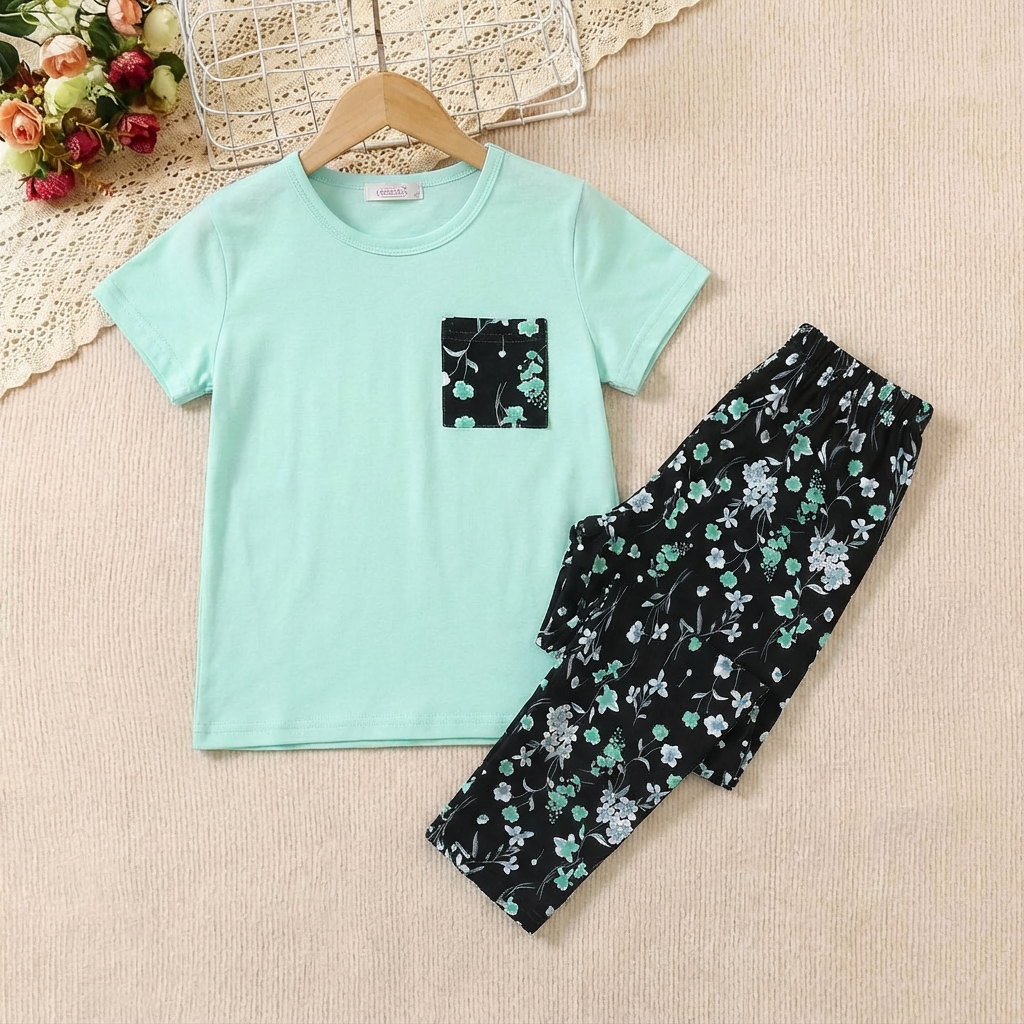تيشيرت بلون تركوازي مع بنطال بلون أسود مورد برسومات ملونة مثل الأزهار.