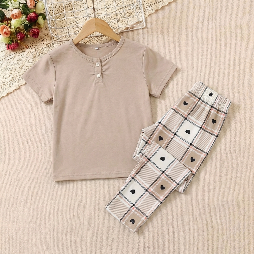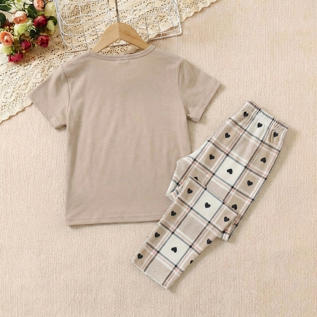 تيشيرت بلون بني مع بنطال بلون مختلط بين الابيض والبني بقصاصات على شكل قلوب ناعمة ومتناسقة.