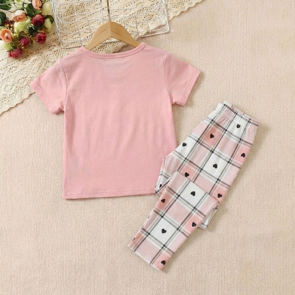 تيشيرت بلون وردي مع بنطال بلون مختلط بين الابيض والوردي بقصاصات على شكل قلوب.