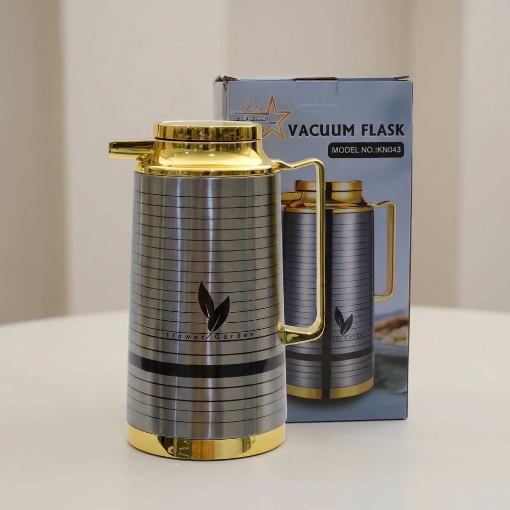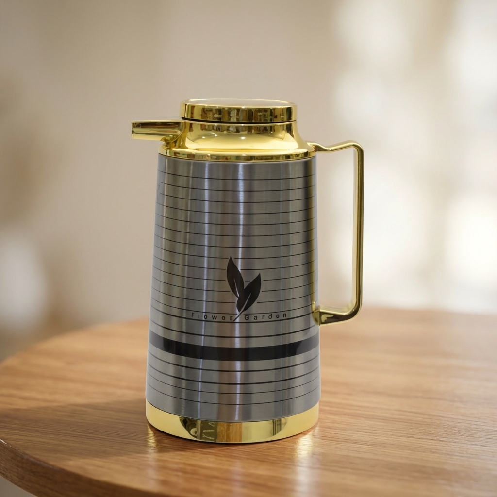 ثلاجة مشروبات بسعة 1 لتر، مصنوعة من الستانلس ستيل، بتصميم أسطواني أنيق يجمع بين اللون الفضي المخطط واللمسات الذهبية في الغطاء والقاعدة والمقبض.
