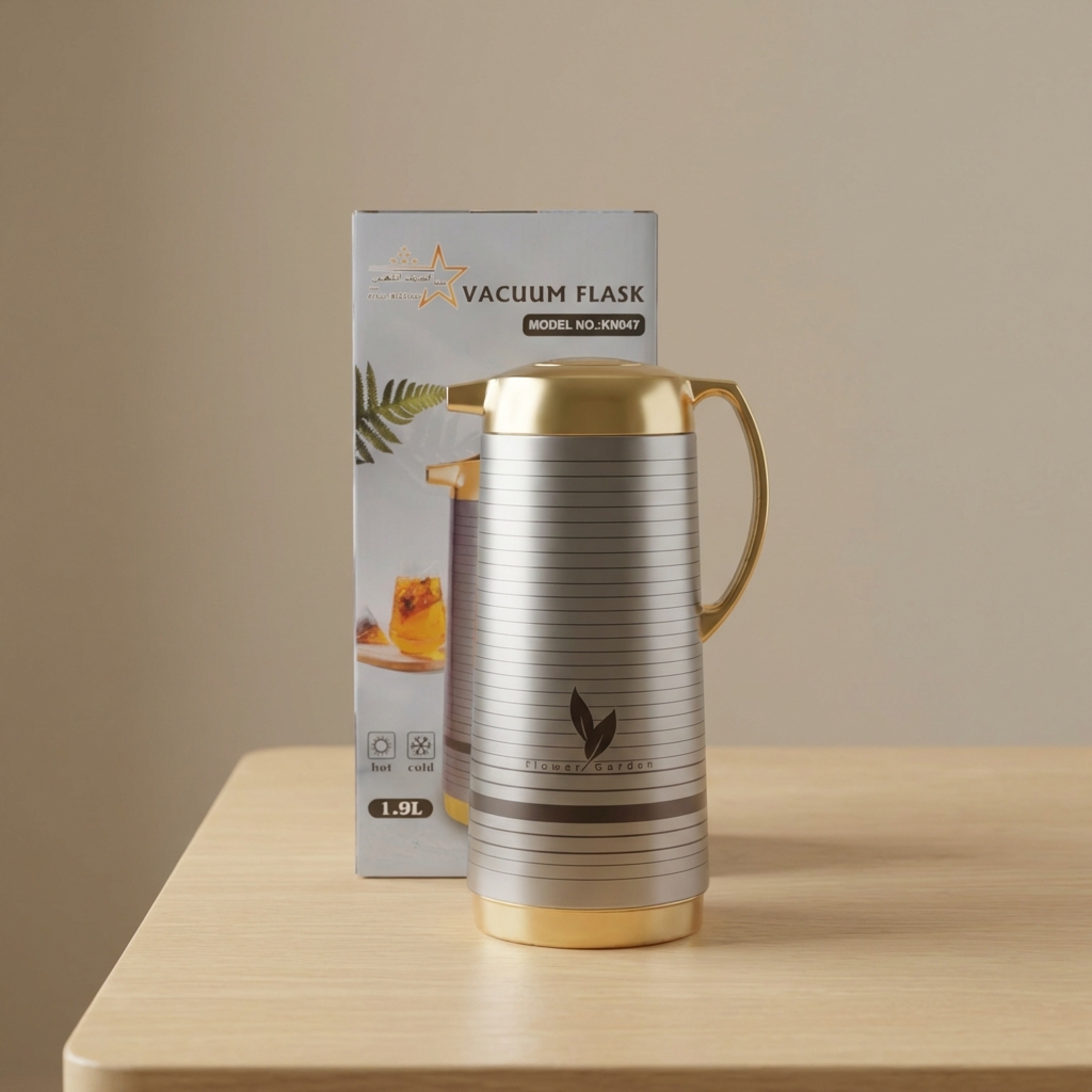 ثلاجة استيل بسعة 1.9 لتر، تتميز بتصميم أنيق يجمع بين اللون الفضي المخطط والتفاصيل الذهبية في الغطاء والقاعدة والمقبض، لتمنح حضورًا راقيًا على طاولة التقديم.صُممت بمقبض جانبي ثابت يسهّل الاستخدام ويوفّر تحكمًا مريحًا أثناء الصب، مع فتحة صب مدمجة في الغطاء تعزز من العملية أثناء التقديم.تُعد هذه الثلاجة خيارًا مناسبًا لحفظ وتقديم المشروبات في الاستخدام اليومي أو في مناسبات الضيافة، بفضل مظهرها المتوازن وجودة تصميمها.