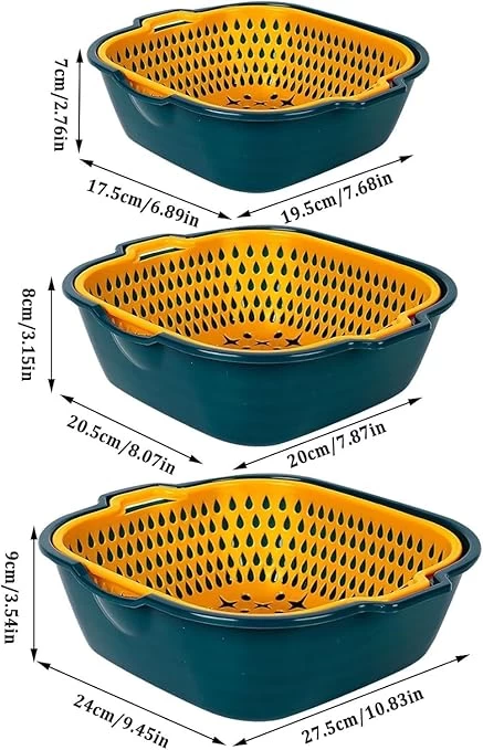 طبقة مزدوجة: تتميز سلة التصريف هذه بتصميم مزدوج الطبقات، ويمكن تحقيق الصرف والتخزين في نفس الوقت، فتحات التصريف جيدة وموزعة بالتساوي لغسل الفواكه والخضروات بسرعة، الطبقة العلوية مصممة للتصريف