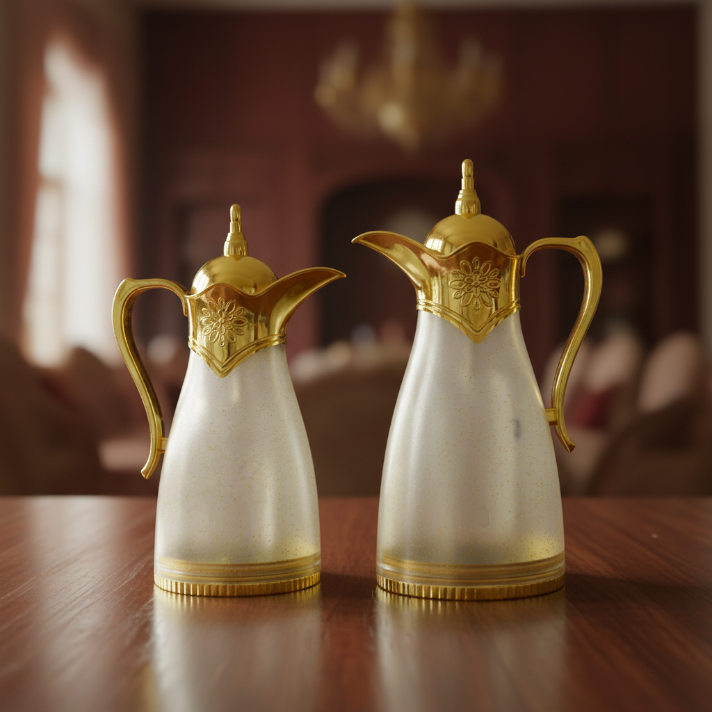 يتميز الطقم بهيكل متناسق مع تشطيب فاخر، ومزين بتفاصيل ذهبية بارزة في الغطاء والفوهة والمقبض، تضيف حضورًا مميزًا على طاولة التقديم.