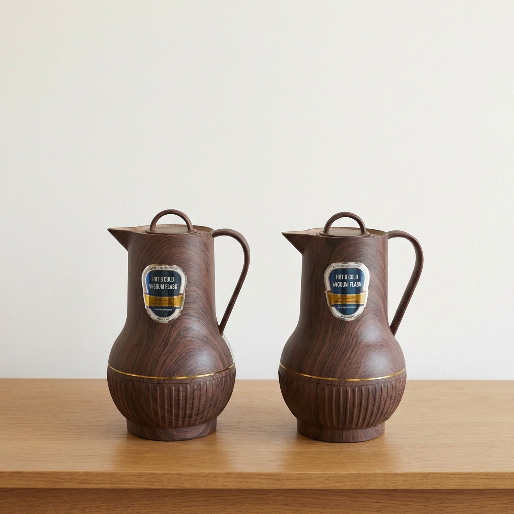 طقم ثلاجة شاي التاج الذهبي مكوّن من قطعتين بسعة 1 لتر لكل واحدة، يتميز بتصميم راقٍ بتشطيب يحاكي ملمس الخشب الطبيعي، يمنح الطقم مظهرًا دافئًا ومتناسقًا على طاولة التقديم.