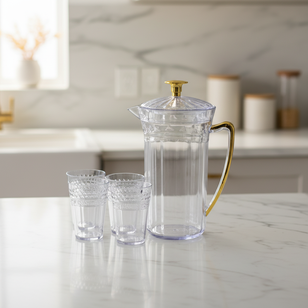 طقم جيك عصير بلاستيك مع 4 اكواب بمقبض ذهبي H2025