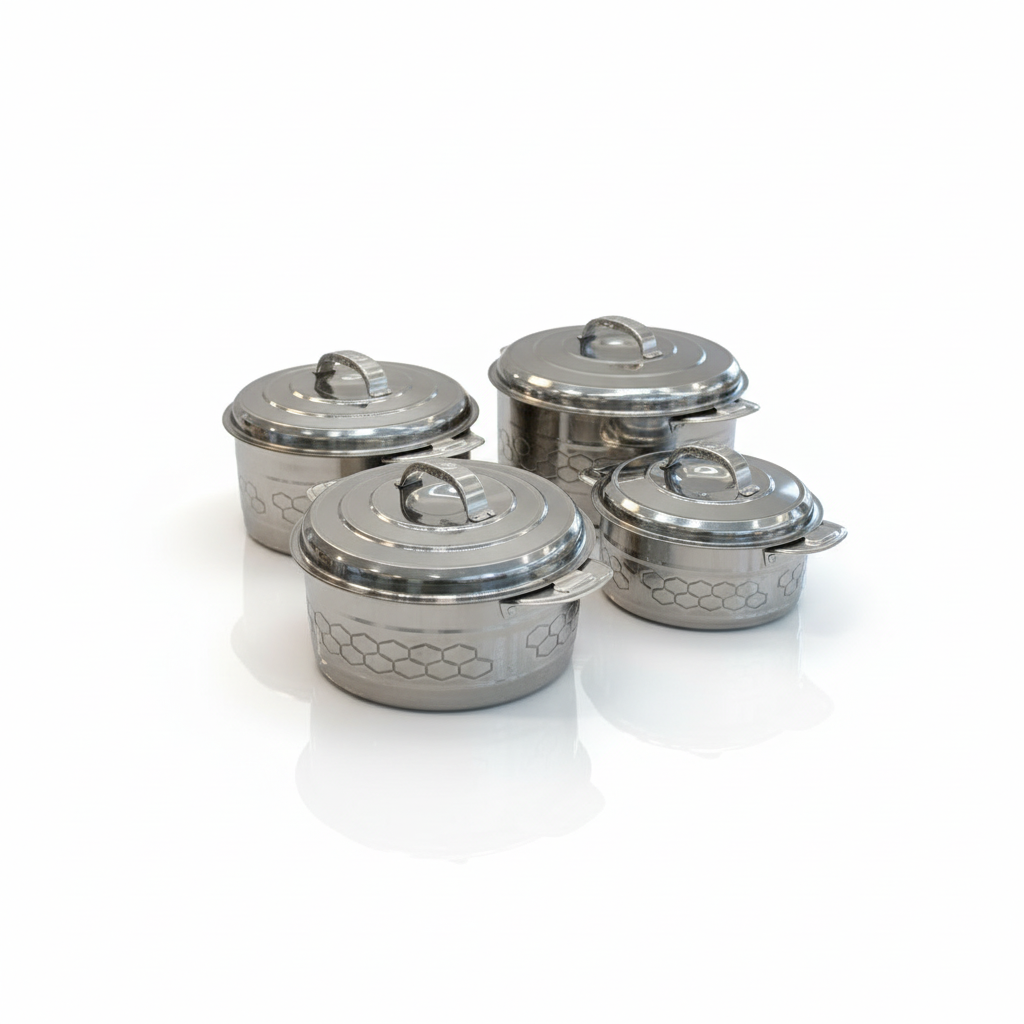 طقم حافظات طعام من الستانلس ستيل مكوّن من 4 قطع، موديل G3-3599-4، يتميز بتصميم عملي يلبي احتياجات الحفظ والتقديم اليومي.