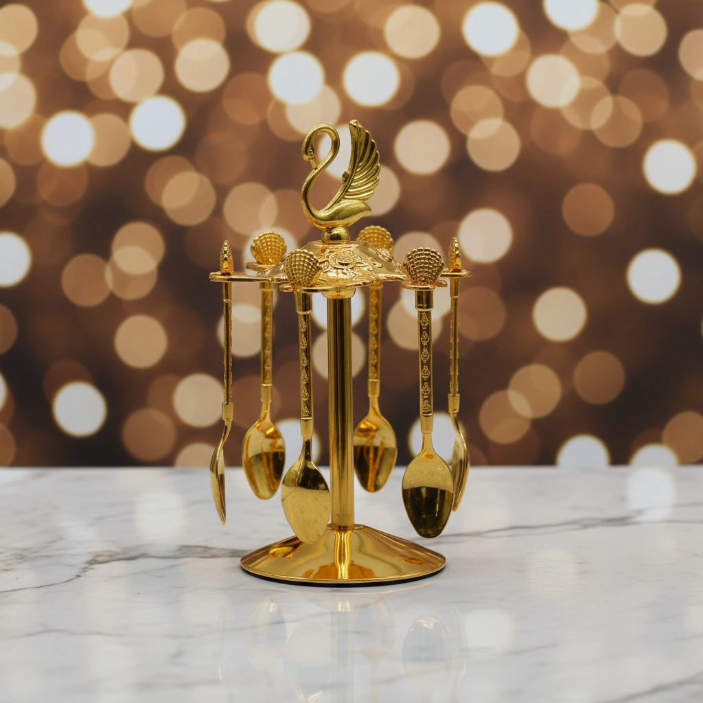 طقم حامل ملاعق الذهبي المذهل يضم 6 ملاعق أنيقة، لتضفي لمسة من الأناقة والرقي على تحضيراتك المميزة. اللمسات الذهبية تعزز أجواء الأناقة والفخامة في أي مناسبة تستعمل فيها هذا الطقم الفريد