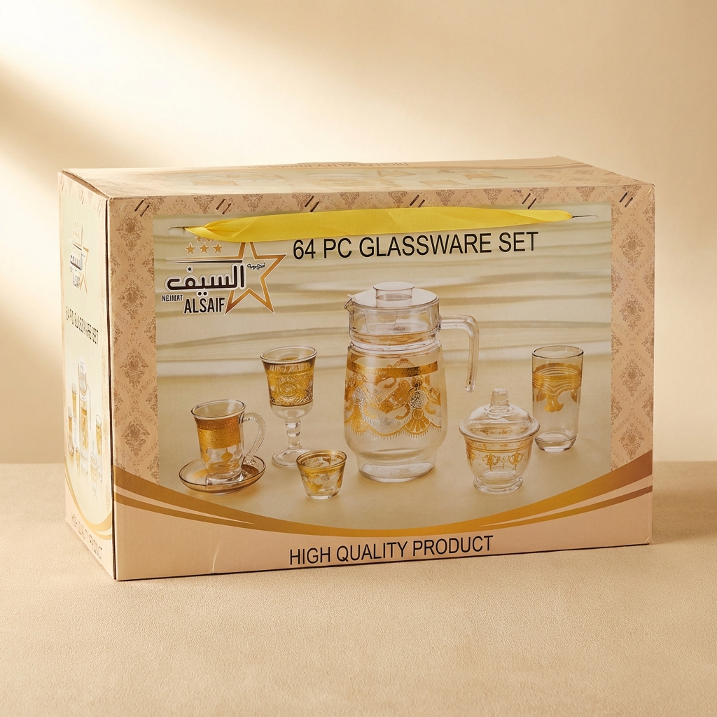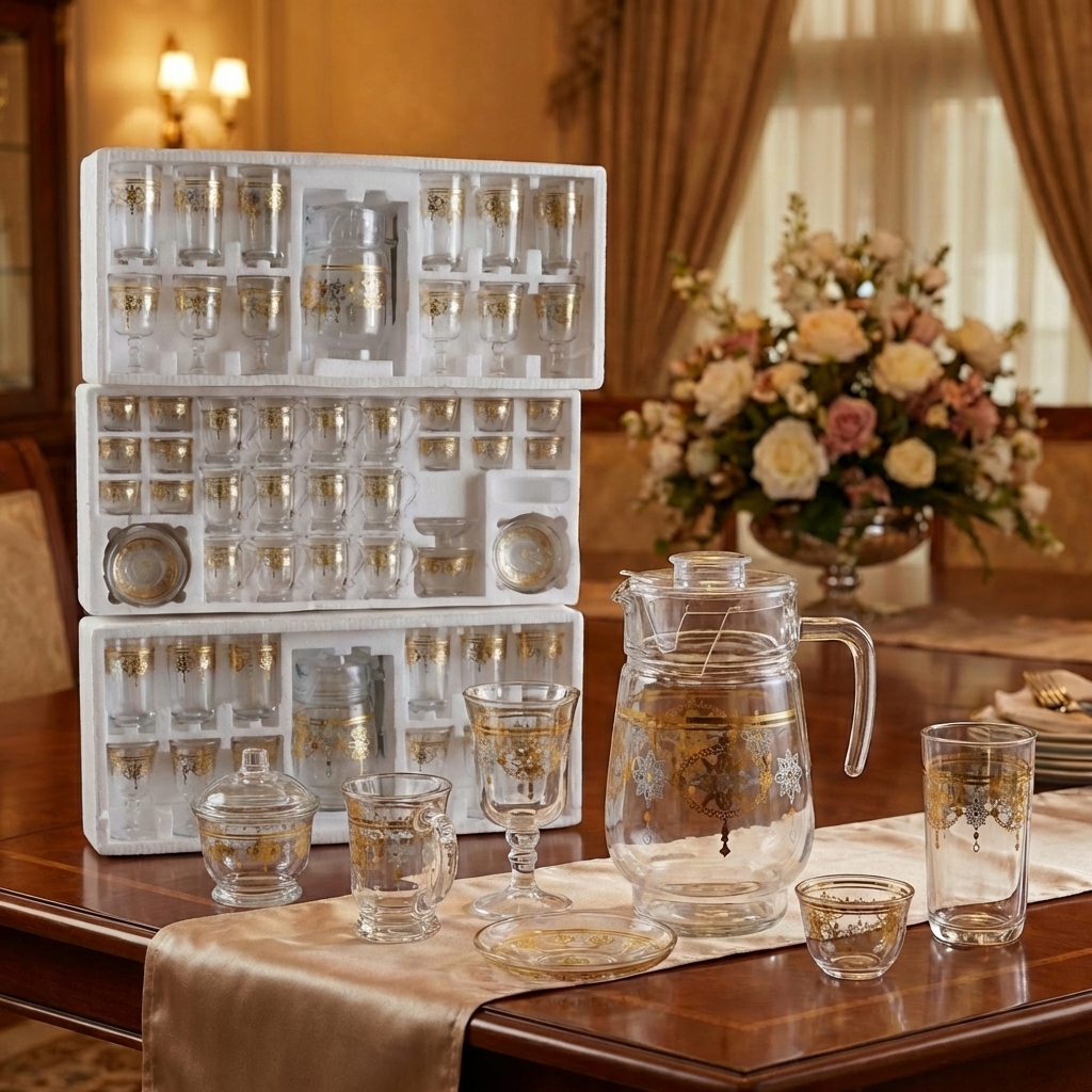 - صُنع الزجاج بجودة عالية تضمن المتانة والوضوح، مع تشطيب أنيق يعكس الذوق الرفيع. كما يأتي الطقم بتغليف منظّم يحافظ على القطع ويسهّل التخزين.