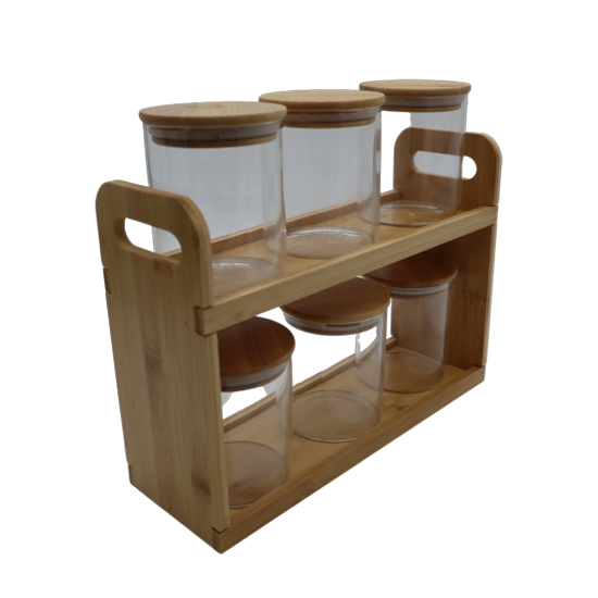 طقم علب بهارات زجاجية مع أغطية خشبية ورف مزدوج – 6 قطع + رف خشبي