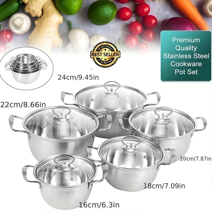 - السعات: يحتوي الطقم على القدور بمقاسات مختلفة (16 سم، 18 سم، 20 سم، 22 سم، 24 سم) لتلبية جميع احتياجات الطهي.