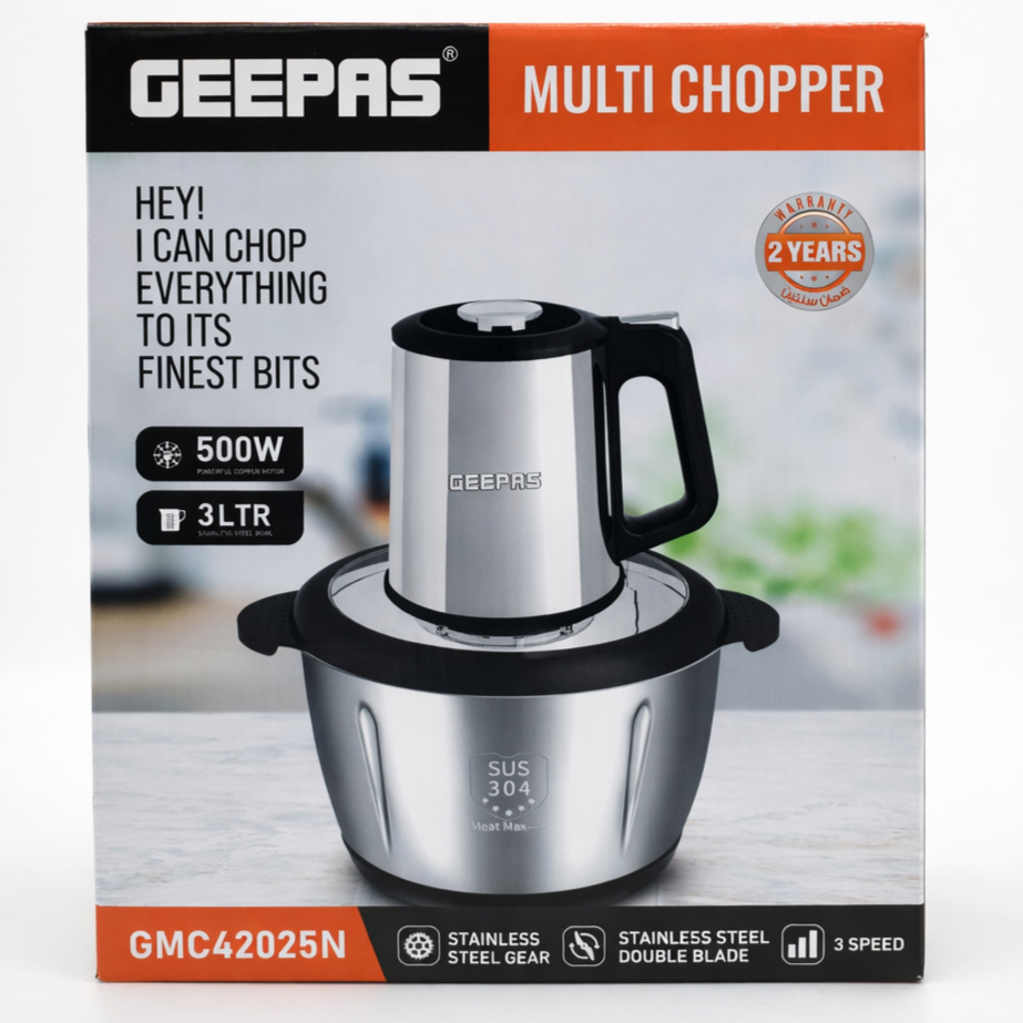 فرامة جيباس متعددة الاستخدام موديل GMC42025 بسعة 3 لتر، مزودة بمحرك قوي بقدرة 500 واط يضمن أداءً فعالًا وسريعًا في فرم اللحوم والخضروات والمكونات المختلفة. تأتي بوعاء مصنوع من الستانلس ستيل عالي الجودة (SUS 304) لضمان المتانة وسهولة التنظيف، بالإضافة إلى شفرات مزدوجة من الفولاذ المقاوم للصدأ لنتائج تقطيع متجانسة.