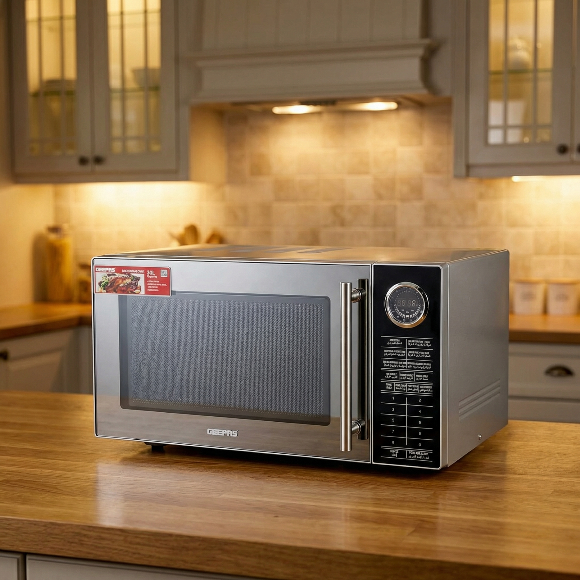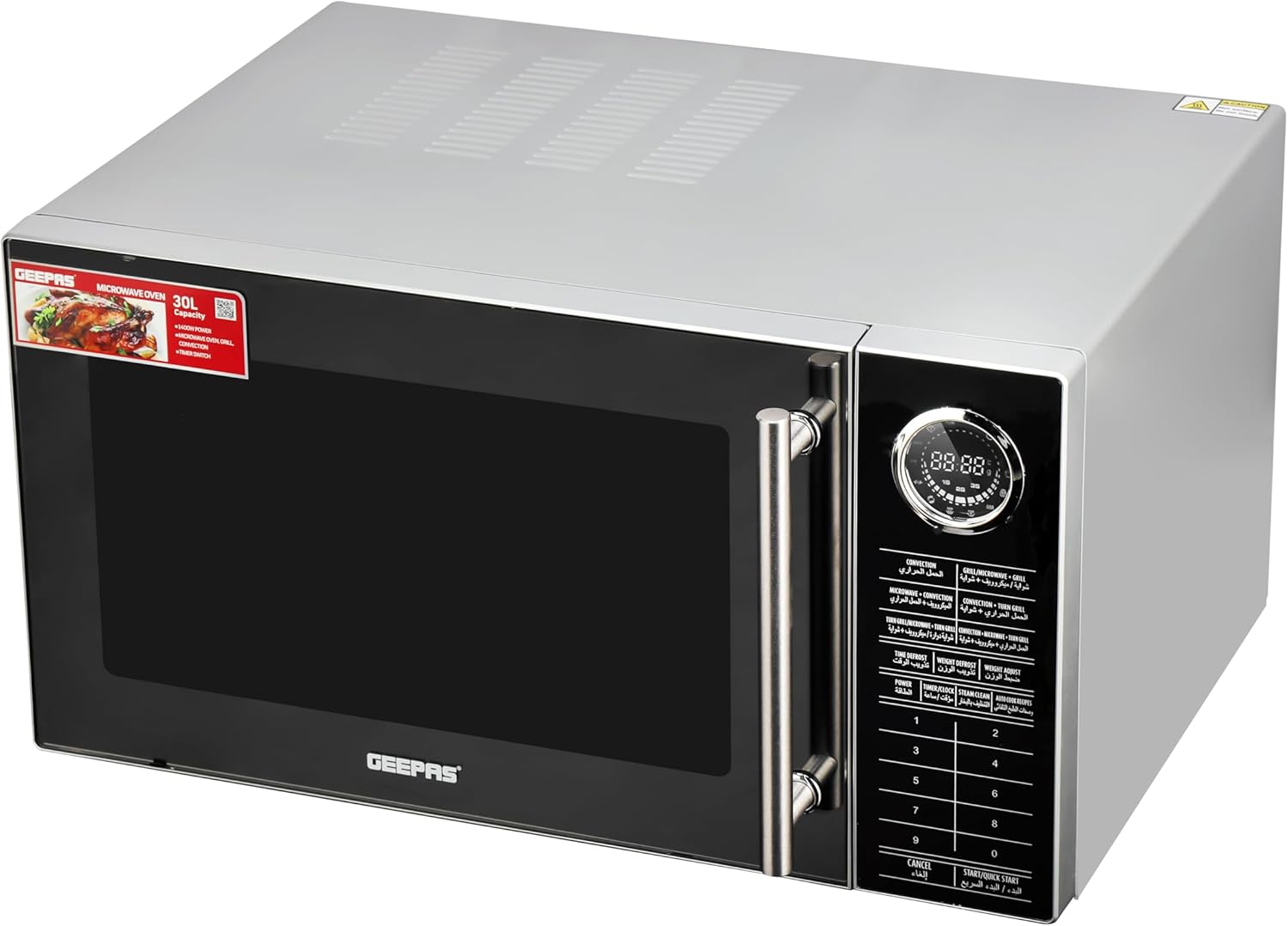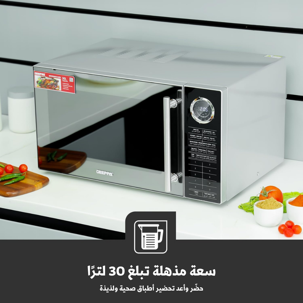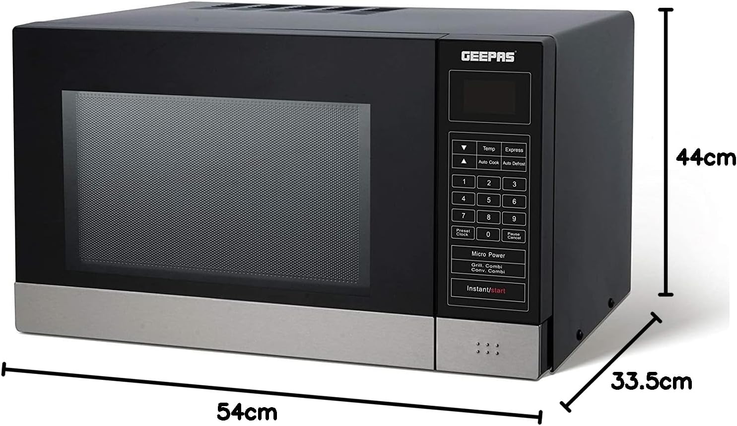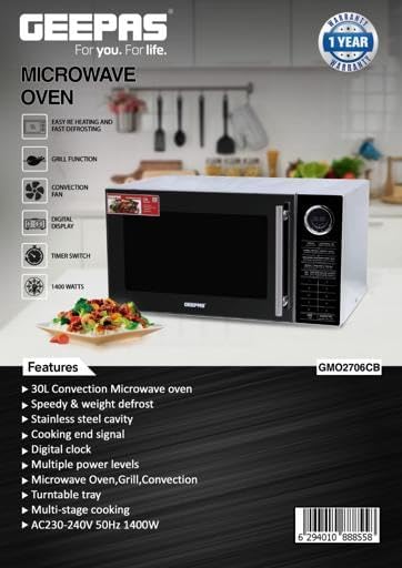 يقدم فرن الميكروويف من جيباس موديل GMO2706CB سعة واسعة تبلغ 30 لترًا، مما يجعله مناسبًا لتحضير وتسخين كميات كبيرة من الطعام بسهولة. يجمع الجهاز بين وظائف الميكروويف، والشواية، والحمل الحراري (Convection) لتوفير مرونة كاملة في الطهي.