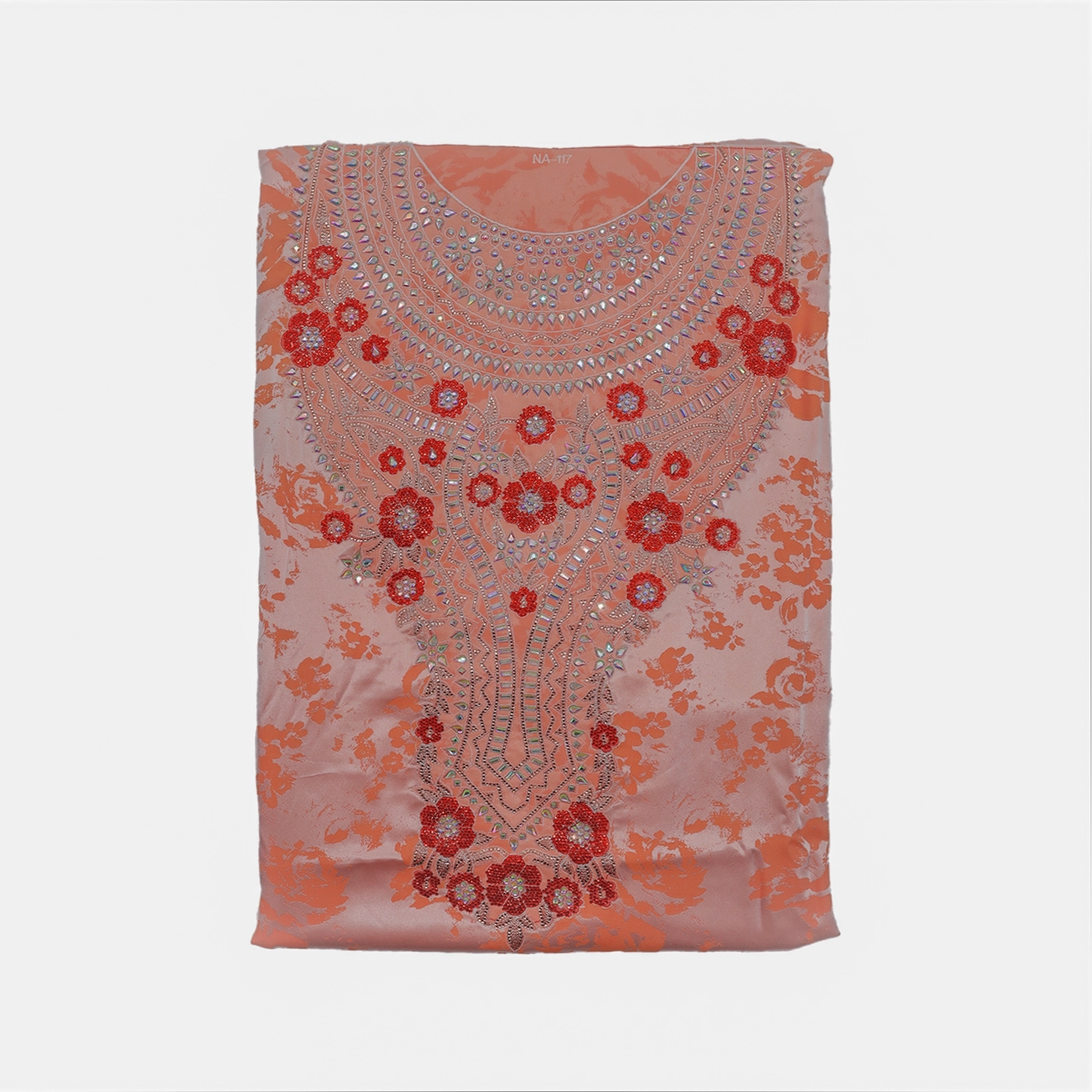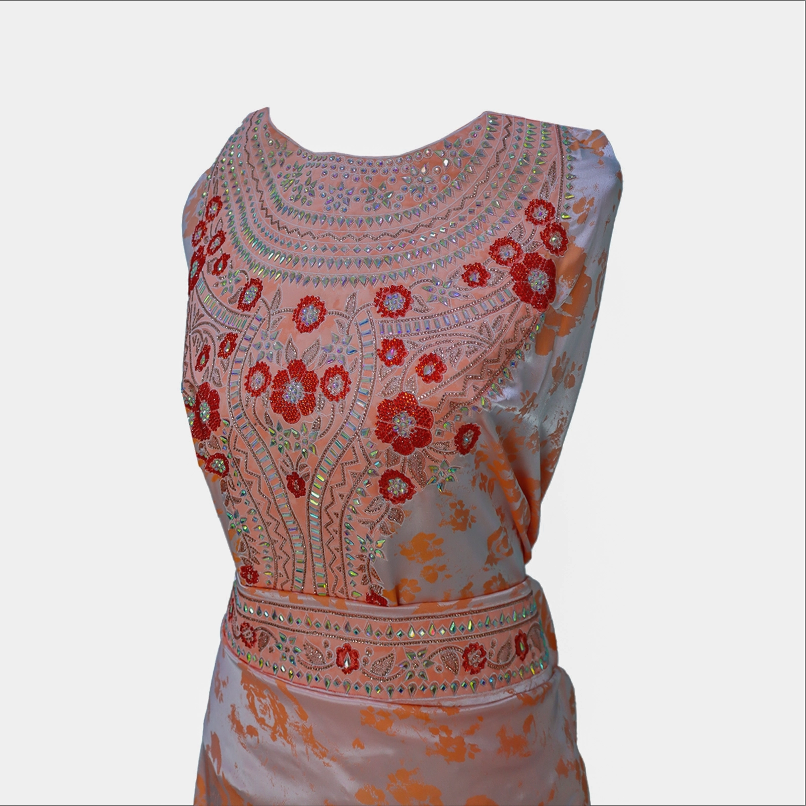 احصلي على مخور حرير جيكارت باللون البرتقالي مع الرسمة المميزة من فصوص الكريستال والحزام الأنيق الآن، وتمتعي بإطلالة مليئة بالأناقة والتميز!
