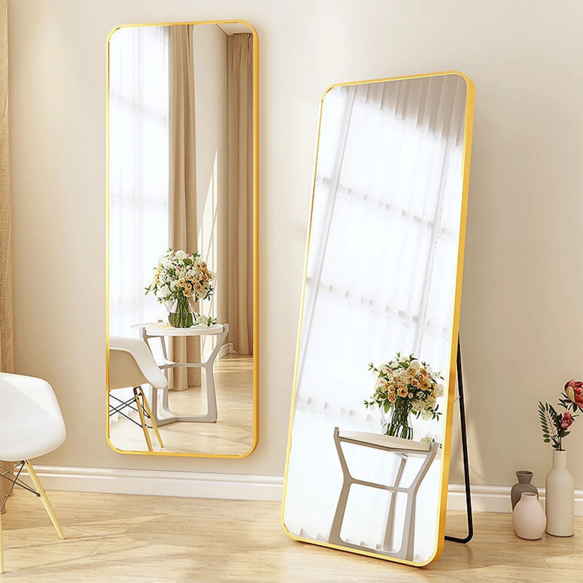 مرآة ديكور مستطيلة التصميم تجمع بين الأناقة والعملية في قطعة واحدة. حوافها الذهبية الفاخرة تمنح الغرفة لمسة راقية ودفء فني، بينما تتيح لك خيارات التثبيت المتعددة إما بتعليقها على الجدار أو إسنادها على الستاند الخلفي، مما يسهل وضعها في أي ركن تفضله. هذه المرآة ليست فقط إضافة جمالية، بل تعزز الإحساس بالمساحة والضوء داخل المكان، مما يجعلها قطعة مثالية للصالونات، غرف النوم، أو حتى المداخل.